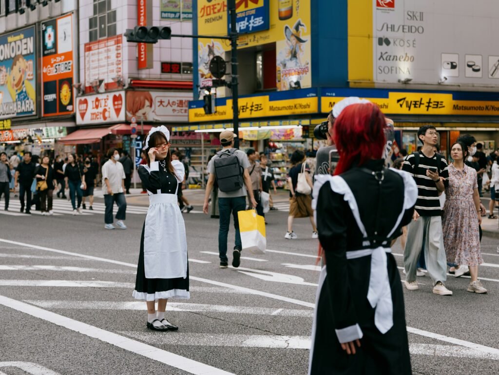 Costumes have their place. Despite what pop culture might suggest, wearing cosplay or anime-inspired clothing on the street isn’t common. When you see costumes in public, it’s usually someone working—promoting a business or event.